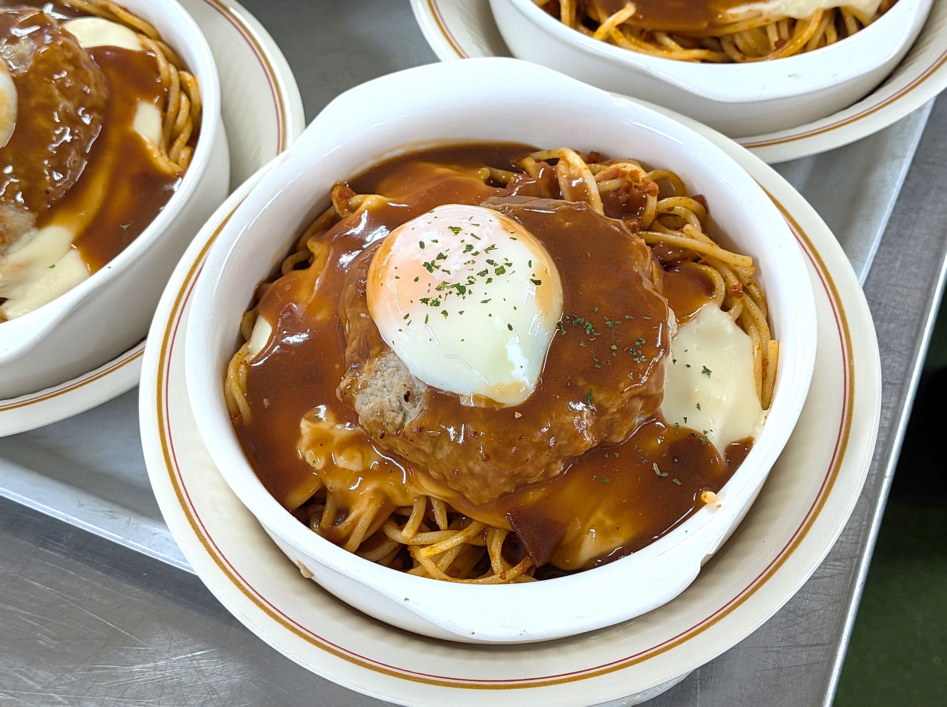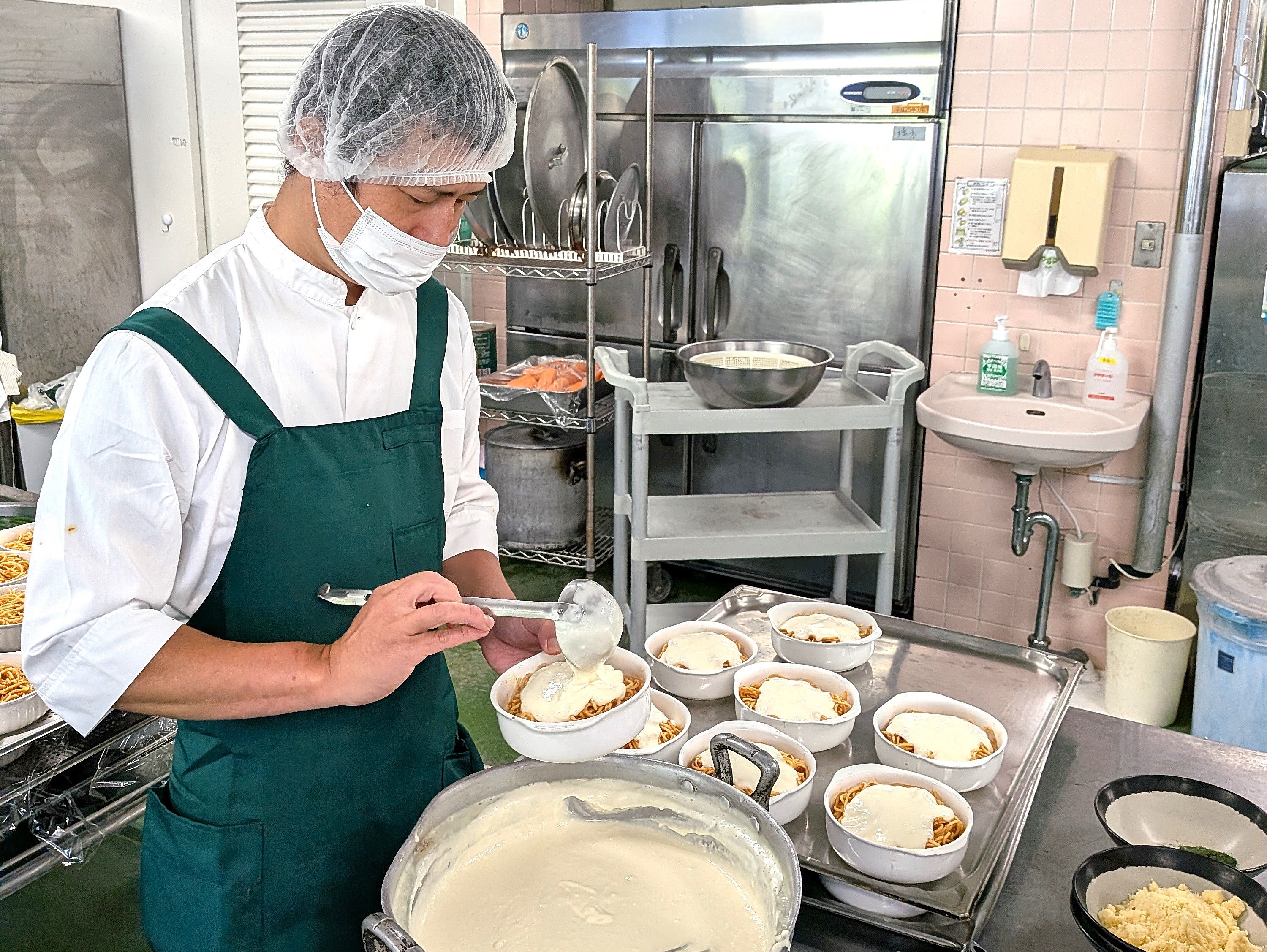 調理スタッフに聞くと、ボロネーゼの上に手作りホワイトソース、そして「月見ハンバーグ」をのせ、仕上げにたっぷりデミグラスソースをかけた、パスタグラタンでした。病院食ではあまり見かけない「パスタ」を主役に据え、月見ハンバーグで秋の雰囲気を演出した、まさにイベント食ならではの一品。普段なかなか食べる機会のないパスタ料理を患者さんに楽しんでもらいたいという、栄養士と調理スタッフの想いから生まれたそうです。