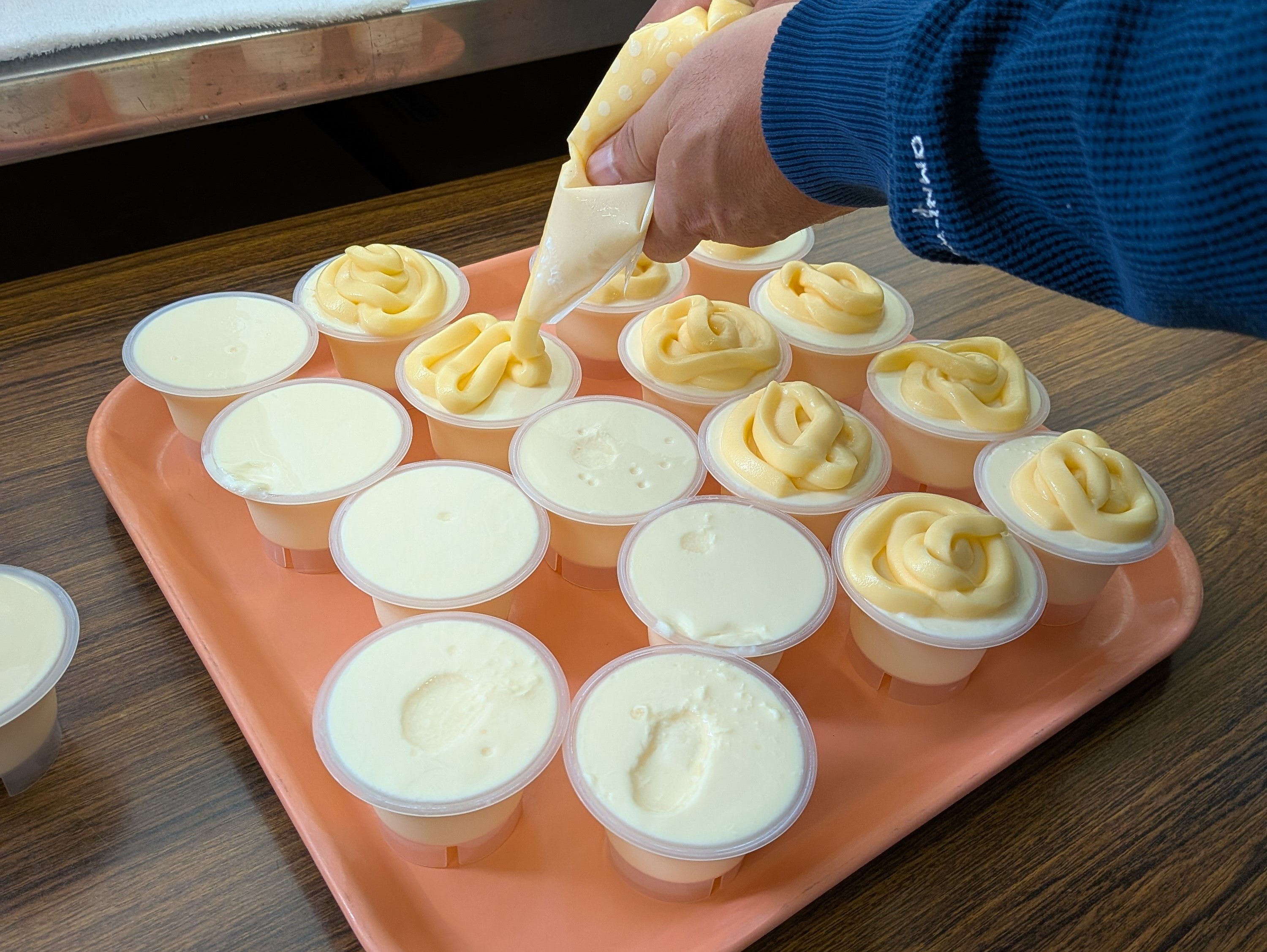 一方で、嚥下機能に不安のある方には、生クリームたっぷりのコーヒーゼリーやカスタード&チョコをトッピングしたプリンをご用意しました。お一人おひとりの状態や好みは違えど、少しでも甘味や特別感を味わってもらいたい。幸せなひと時を過ごしてもらいたい。それが私たちスタッフ全員の願いです。