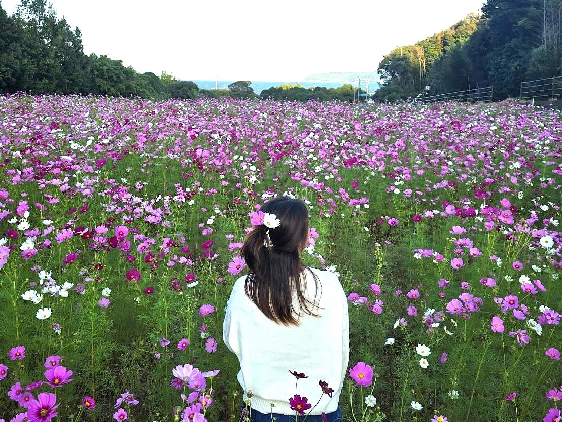 一面に広がる色鮮やかなコスモスたち。その秋風に揺れる様はとても愛らしいものがあります。