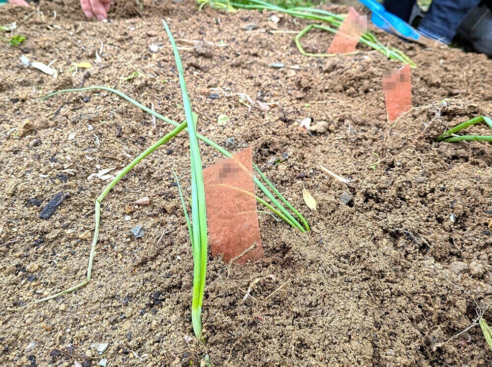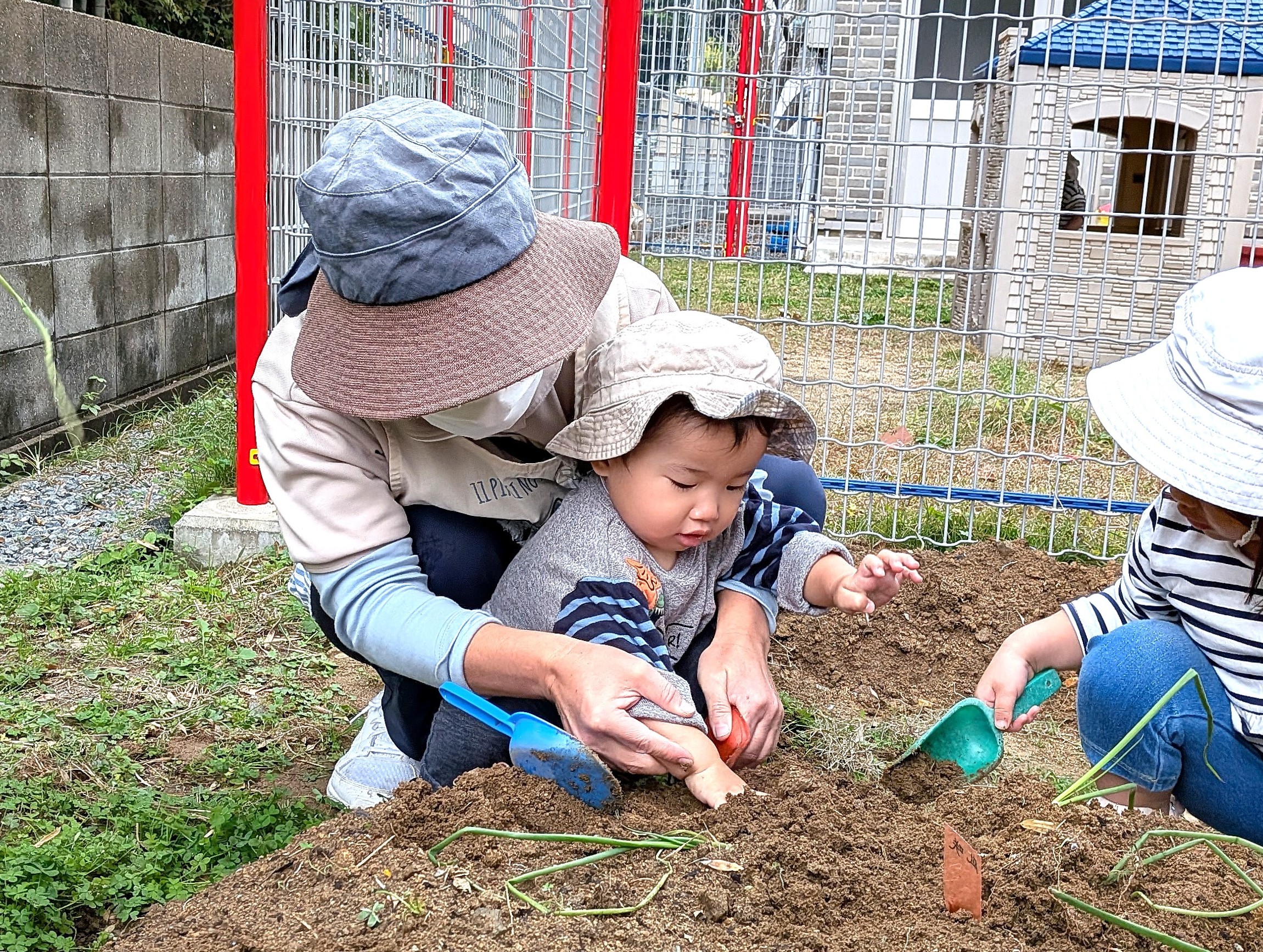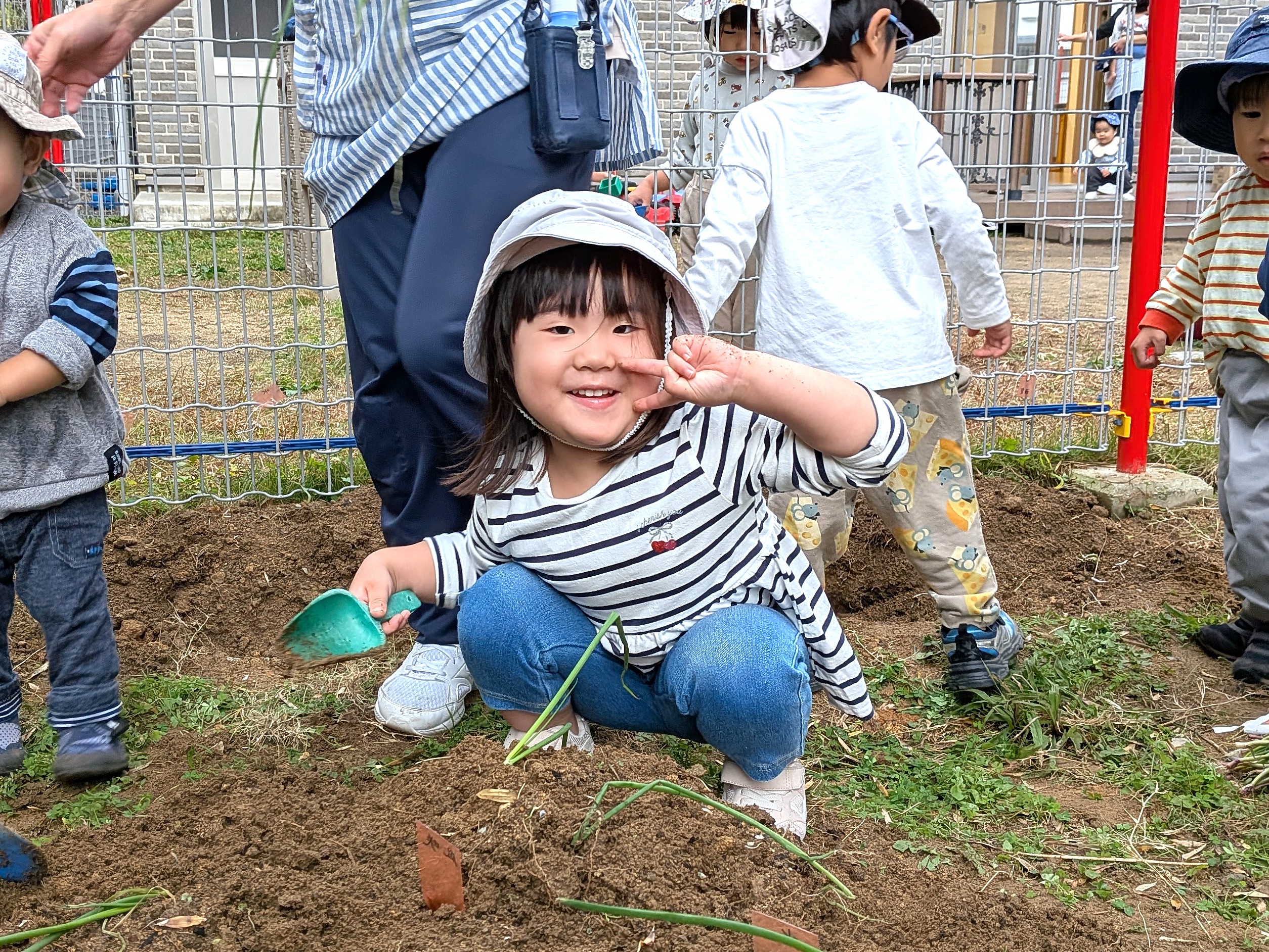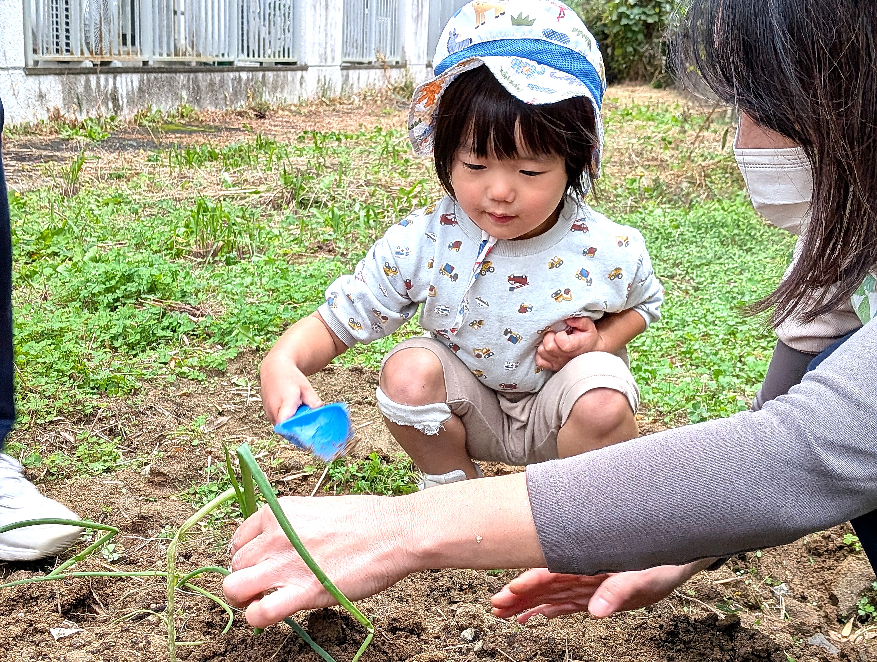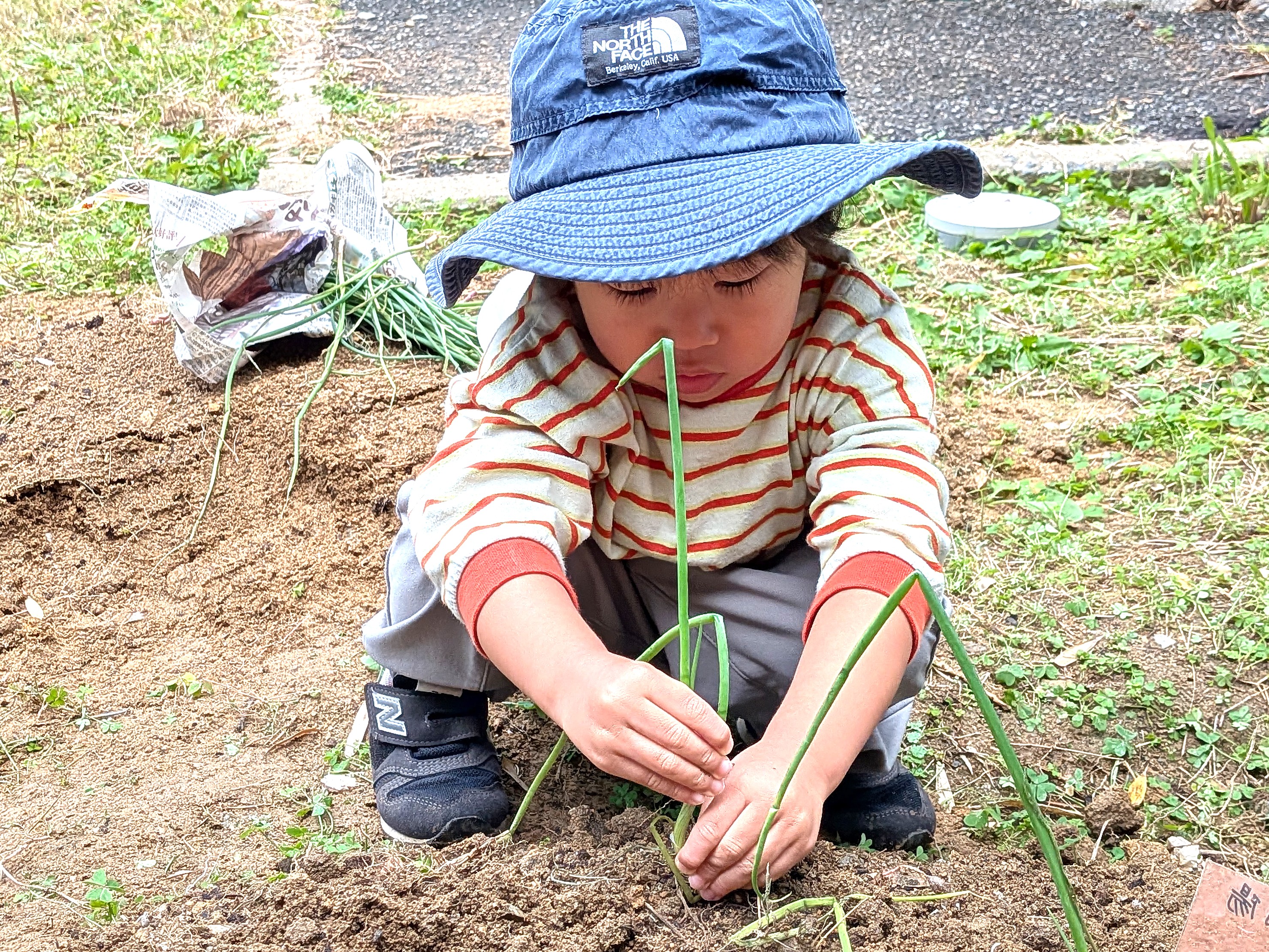 ひんやりと湿った土にスコップを入れると、ふわりと立ち上がる土の香り。子どもたちは土の感触を楽しむように何度も何度も掘っていました。小さな手で玉ねぎの苗をそっと持ち、倒れないように気を配りながら、優しく土をかぶせる姿はとても微笑ましいものでした。
