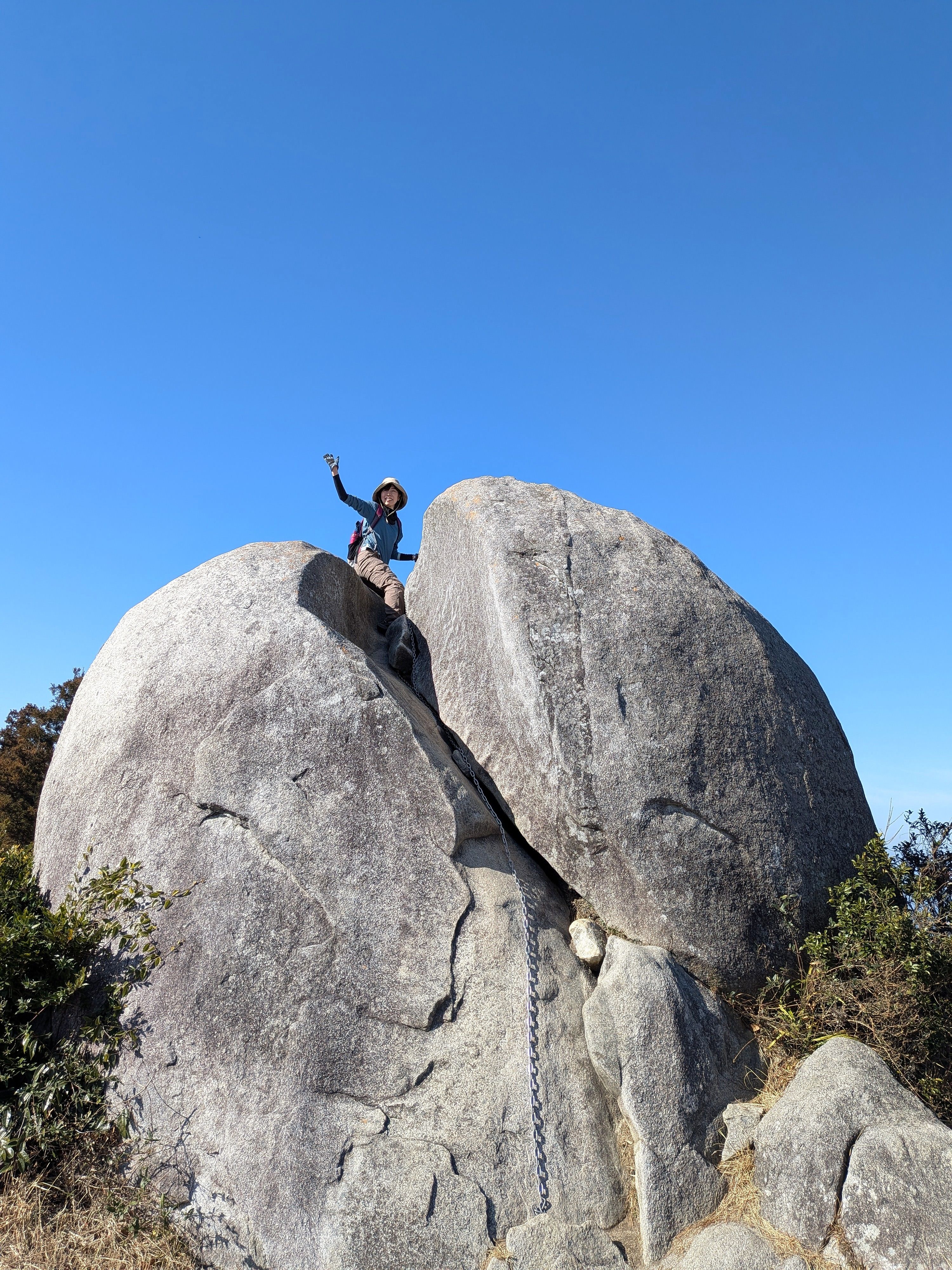途中で休憩をはさみながら、35分の道のりを45分ほどかけて登りきると、突然視界が開け、目の前にそびえ立つような巨石が現れます。その名は坊主岩。備えつけてある鎖を頼りに岩をよじ登ると、360度の絶景が広がっていました。高所恐怖症の私は、足がすくみ、岩の上に腰を下ろすだけで精一杯でしたが、岩上に立つ姿はインスタ映え必至のスポットです!そこから西側を見渡せば、虹の松原の美しい海岸線が一望できます。空気が澄んでいれば、壱岐、対馬の島影も見えるそうです。東側には浮岳、女岳、二丈岳が連なり、雄大な山の景色が広がります。気軽に絶景が楽しめる十坊山は、家族連れにもおすすめの山です。
