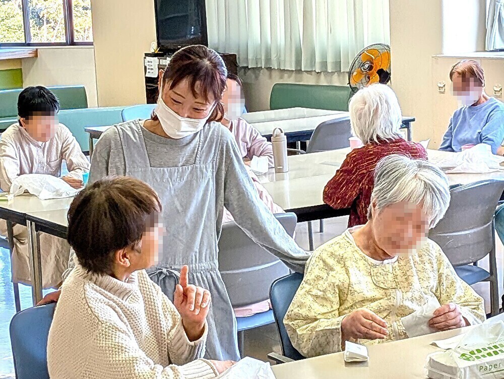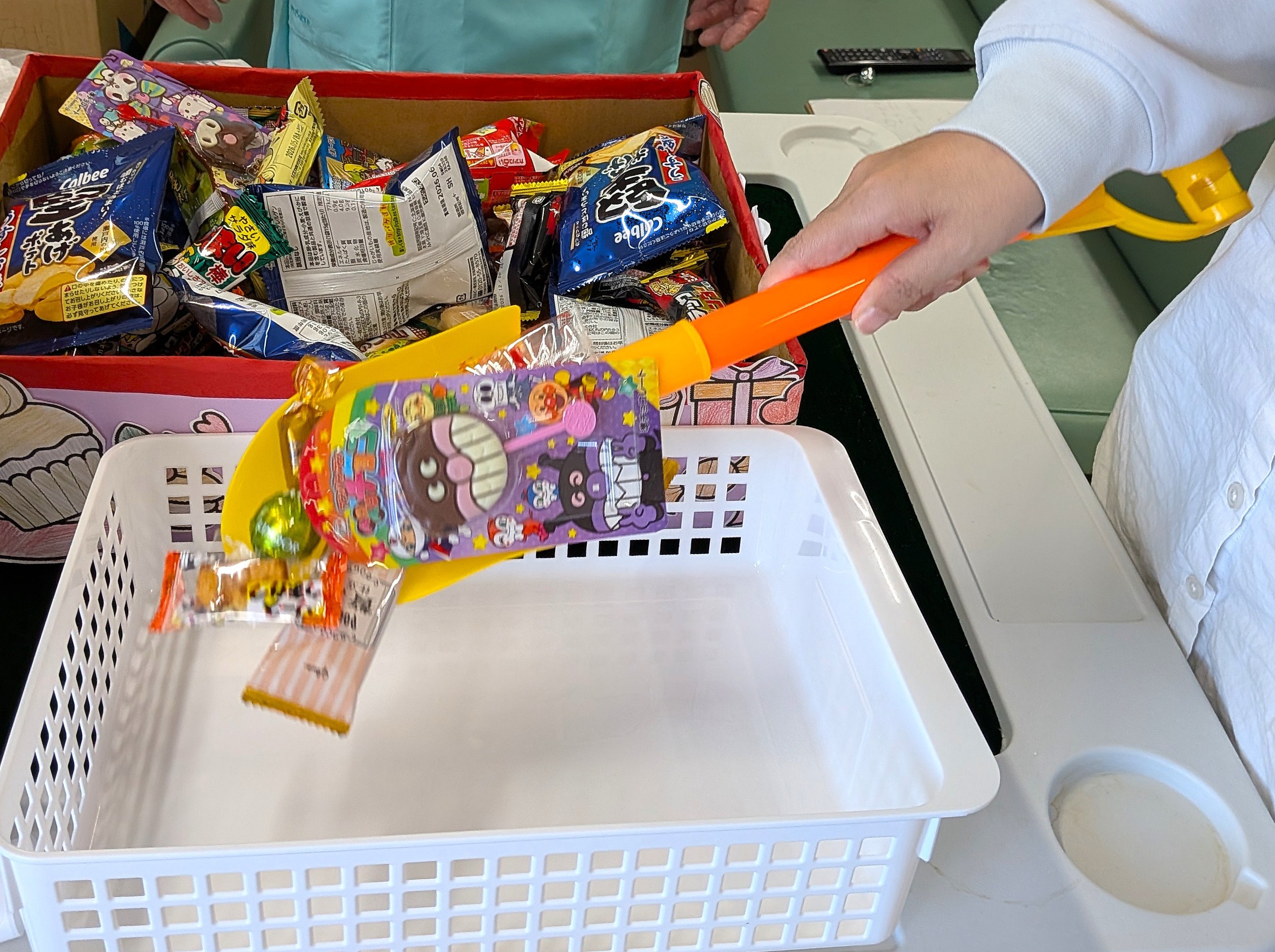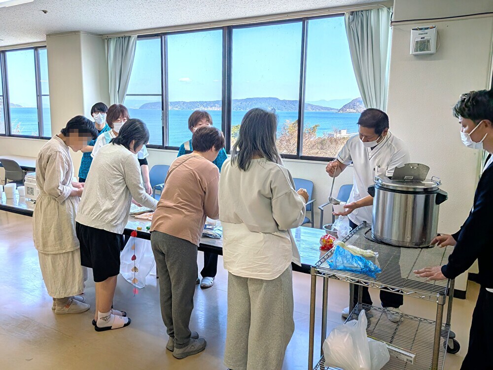 スコップでチョコレート菓子をすくうシンプルなゲームですが、「これを楽しみにしとったとよ」「ジャイアントカプリコが欲しい!」と、皆さん童心に返ったように挑戦されていました。職員の声援を受けながら真剣に、そして楽しそうに取り組まれる姿から、日頃のあたたかな病棟の雰囲気が伝わってきました。
