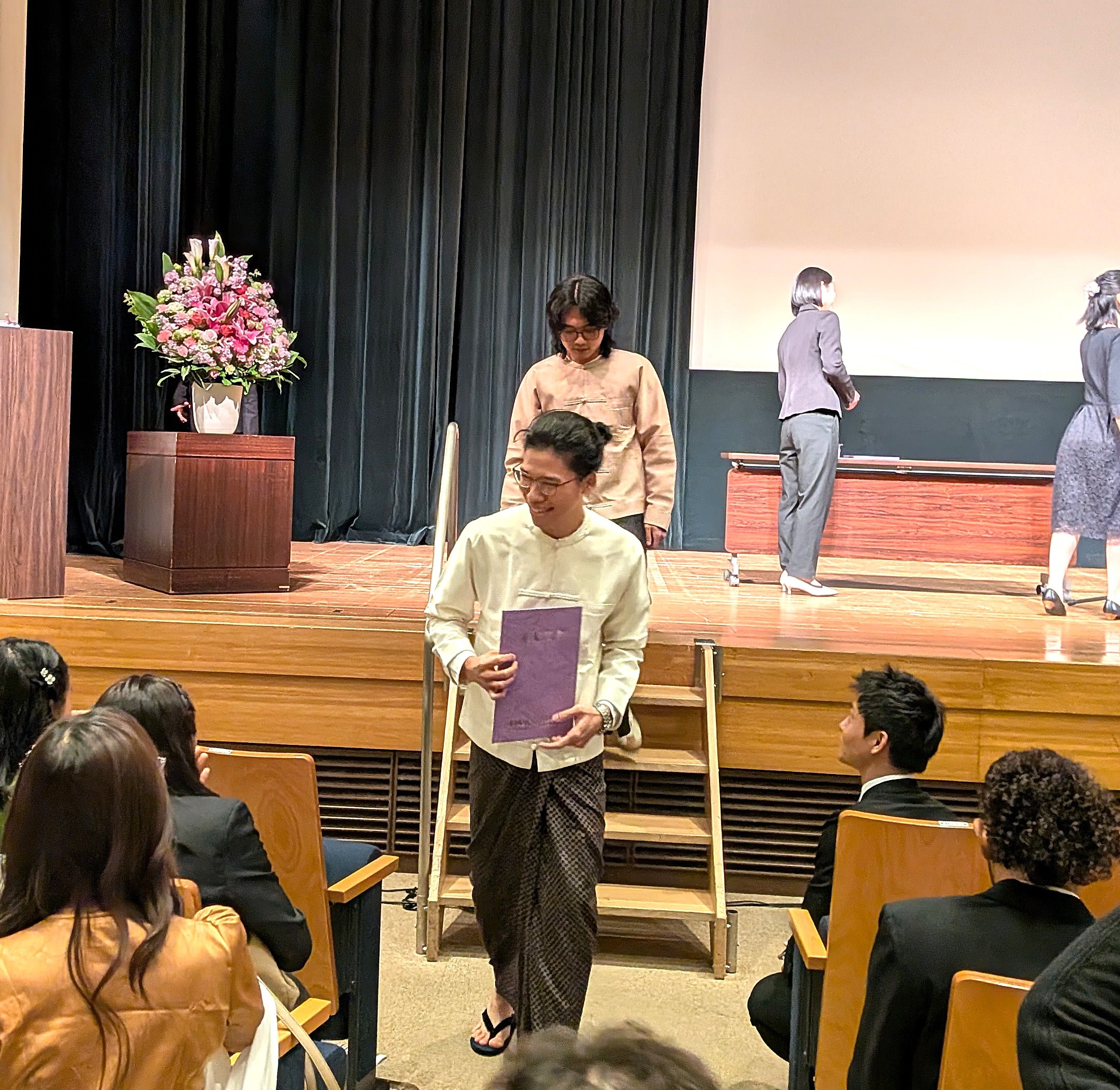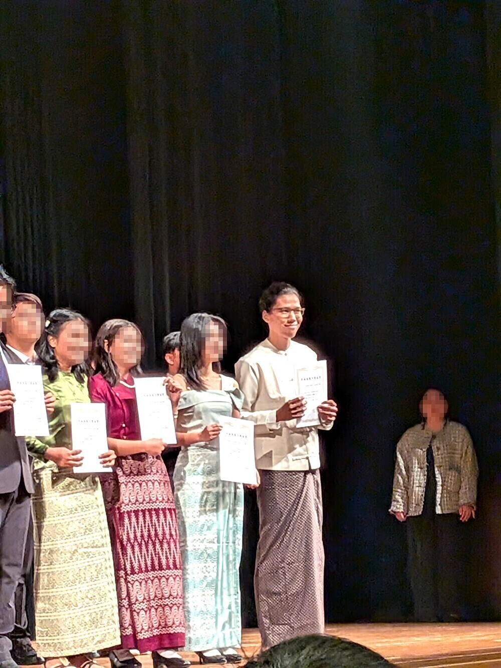 また当院留学生からもう一つ。余興としてミャンマーの恋心を歌った楽曲の弾き語りの披露もありました。言葉を越えて、こころに響くものがあったのだと思います。歌い終わると、自然に会場は温かな拍手で包まれました。異なる文化をもつ仲間たち同士。日本という異国の地で学び合った日々。それらが留学生たちにとって、かけがえのない経験となっていること感じられたひとときでした。