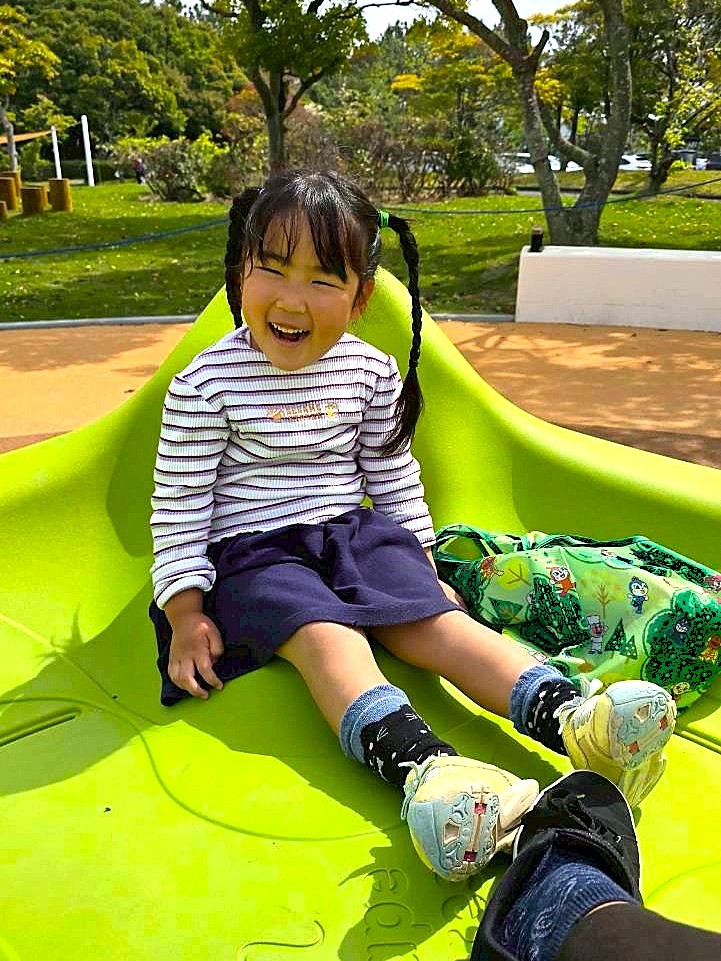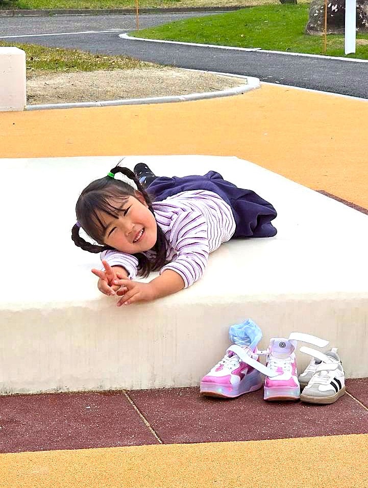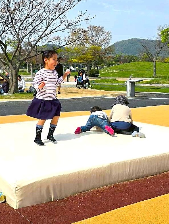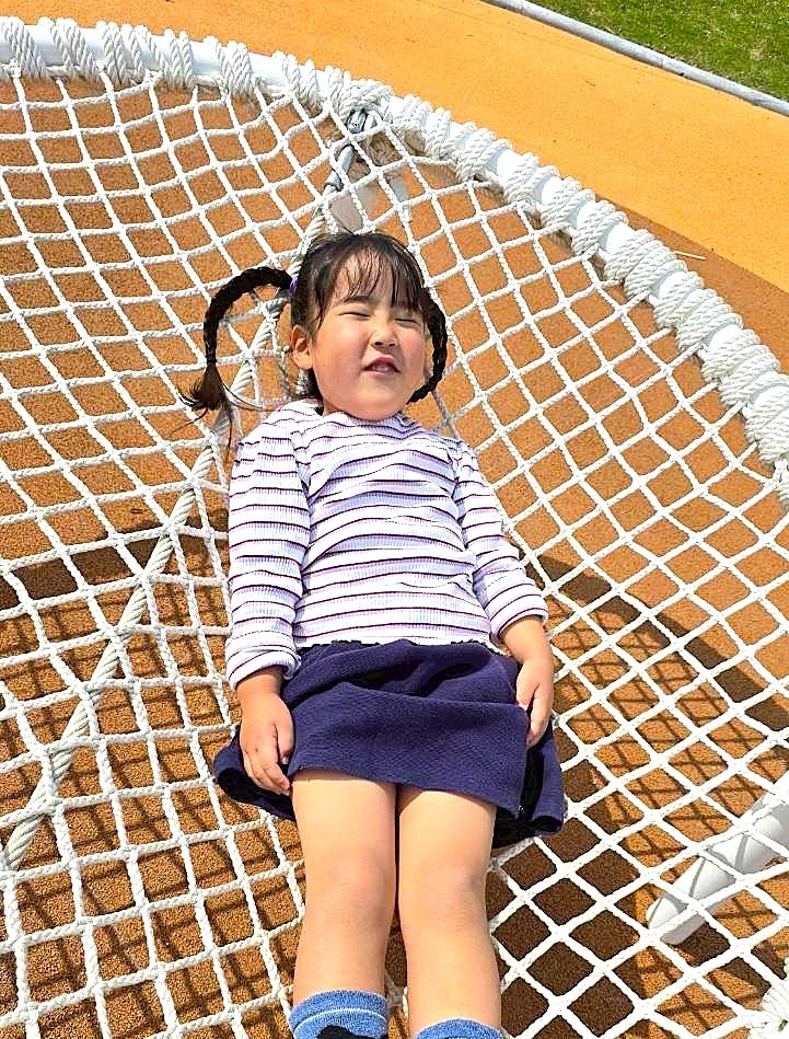 お次はジャンプ遊具です。よくあるゴム性のトランポリンではなく、野外には珍しいマット仕様。その軟らかさのおかげで、たとえ転んでも怪我は防げそうです。また野外ならではの開放空間ですから、好きなだけ、飛んだり跳ねたりすることができます。ここでは、自宅のように、ベッドで飛び跳ねてうっかり天井に穴をあけてしまったり、転倒して注意されたりする心配もありません(笑)心置きなく堪能したMちゃんも、遊び疲れて寝転んでしまうほどでした。