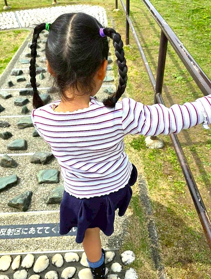 この日のしめくくりに「健康遊歩道」エリアへ。そこには様々な大きさや形の石が敷き詰められた小道があります。全長約70m。靴を脱いでその上を歩くことで足のツボが刺激されるのですが…石の形によっては大きな試練?!「イタタ…」と思わず口に出ること受け合いです。Mちゃんはというと、細く尖った石のコーナーは華麗に避けて無事ゴール(笑)歩き終わった後は足がポカポカと温かくなり直ぐに効果を実感できます。