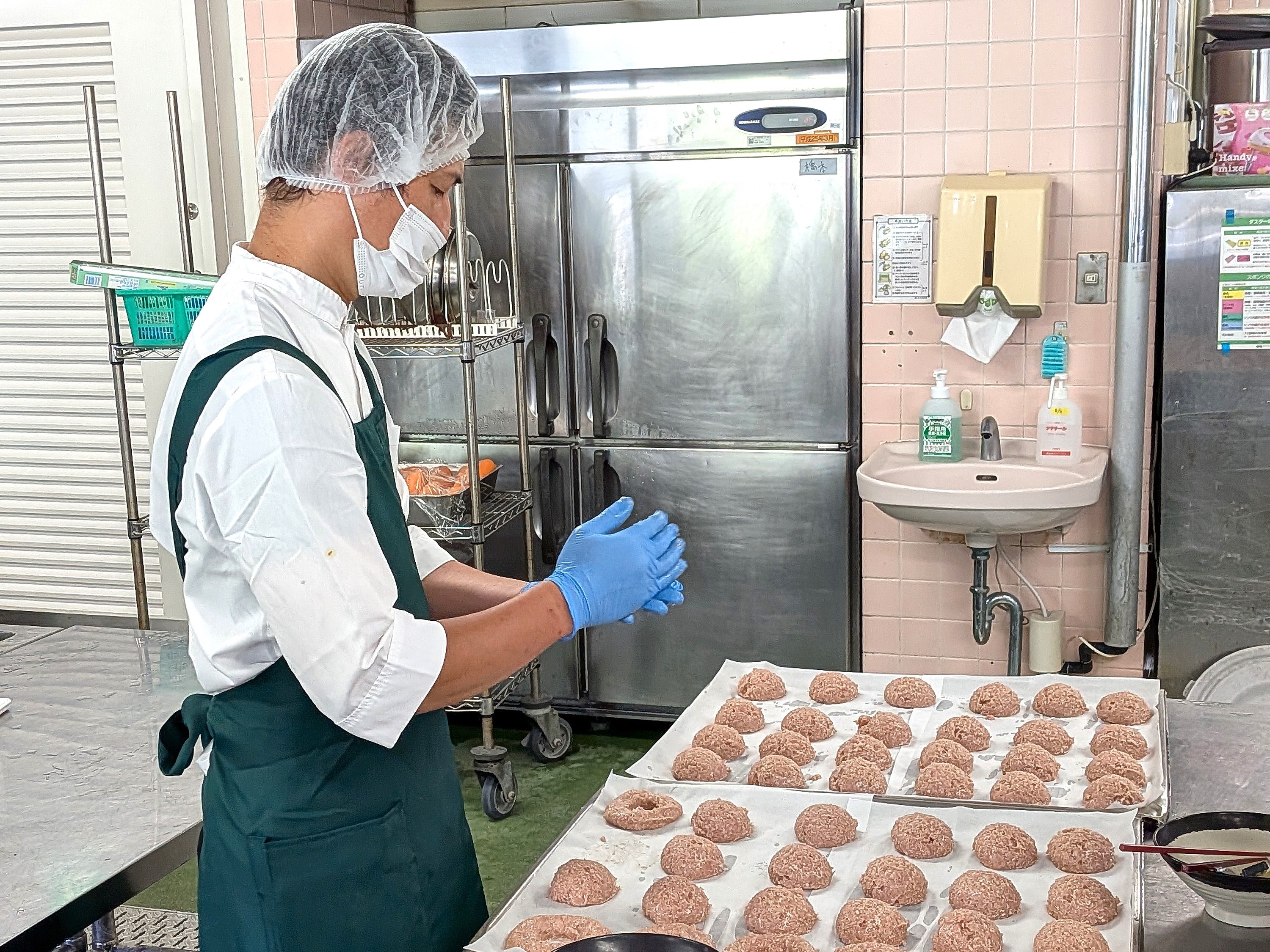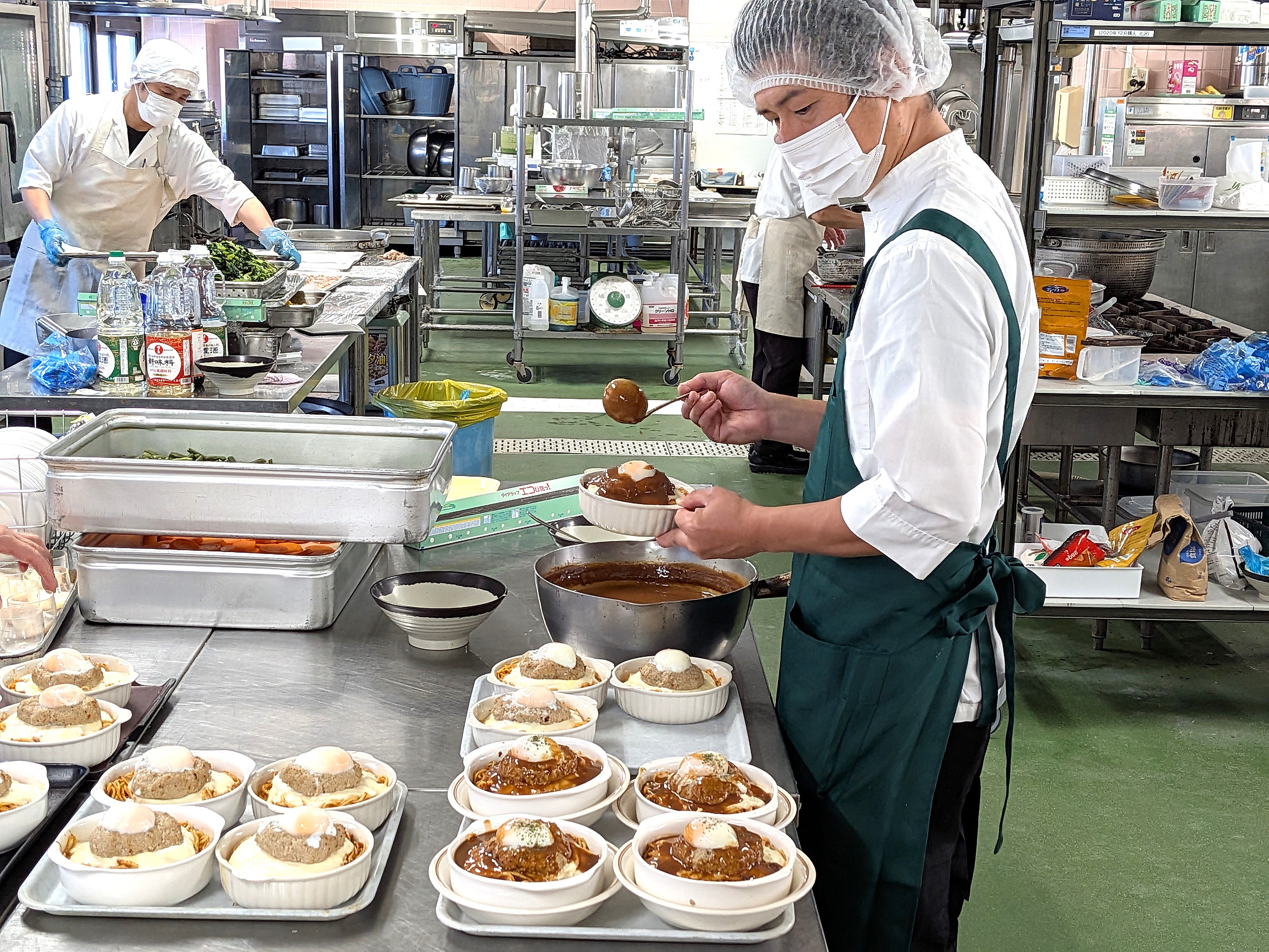 もちろん、今回も全て手作り。60人分の料理を、一つひとつ心を込めて丁寧に仕上げました。中でも工夫したのが、「ハンバーグ」。嚥下機能が低下した方にも安心して食べていただけるよう、柔らかさにとことんこだわりました。玉ねぎをミキサーにかけてから炒める事で、自然な甘みと水分を引き出し、それをタネに加えることで、ふんわりジューシーな仕上がりになります。手間を惜しまない姿勢に、プロの技とこだわりが。食べる人への想いも一緒にこねて、入れられているのを感じます。
