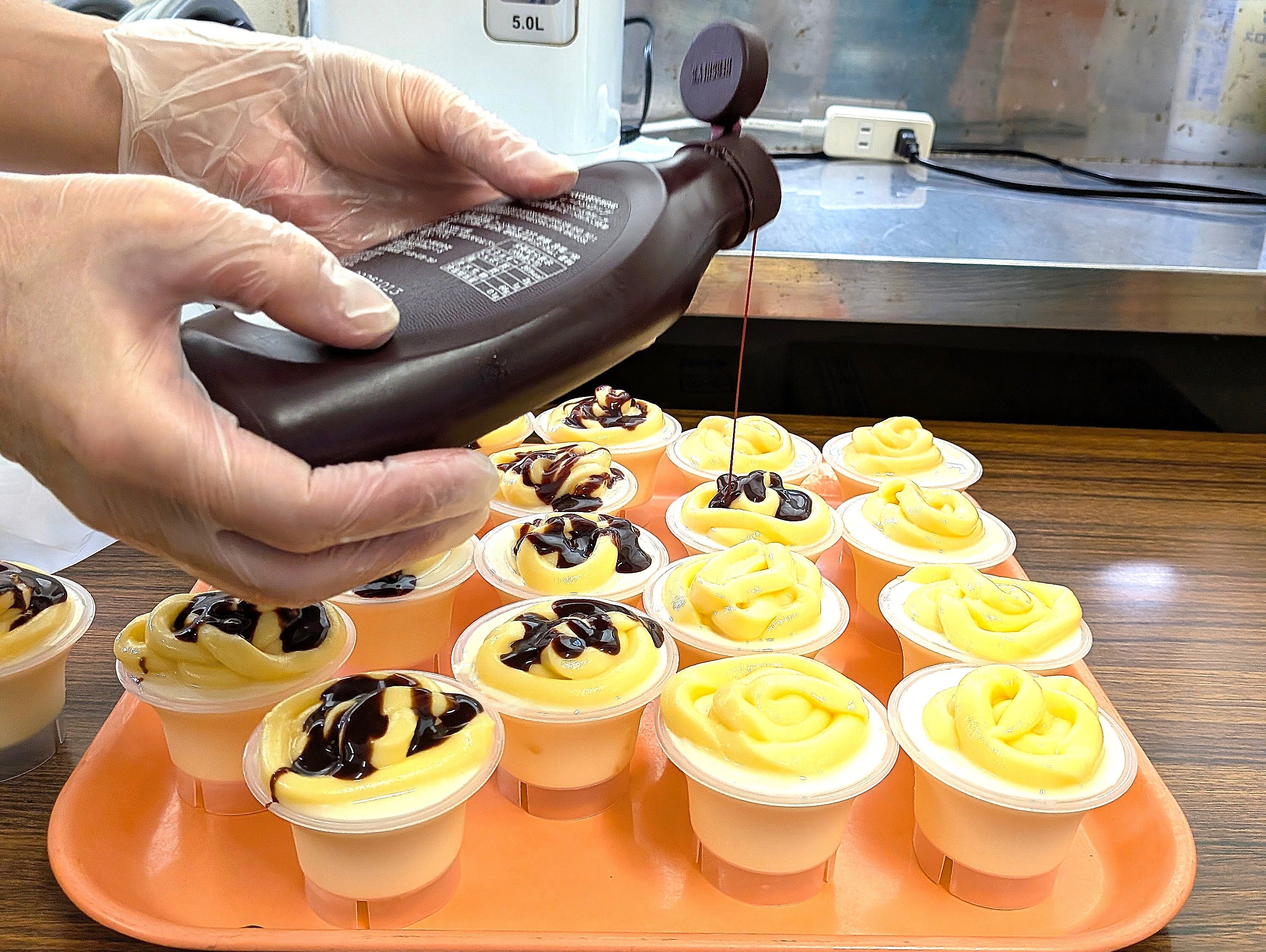 一方で、嚥下機能に不安のある方には、生クリームたっぷりのコーヒーゼリーやカスタード&チョコをトッピングしたプリンをご用意しました。お一人おひとりの状態や好みは違えど、少しでも甘味や特別感を味わってもらいたい。幸せなひと時を過ごしてもらいたい。それが私たちスタッフ全員の願いです。