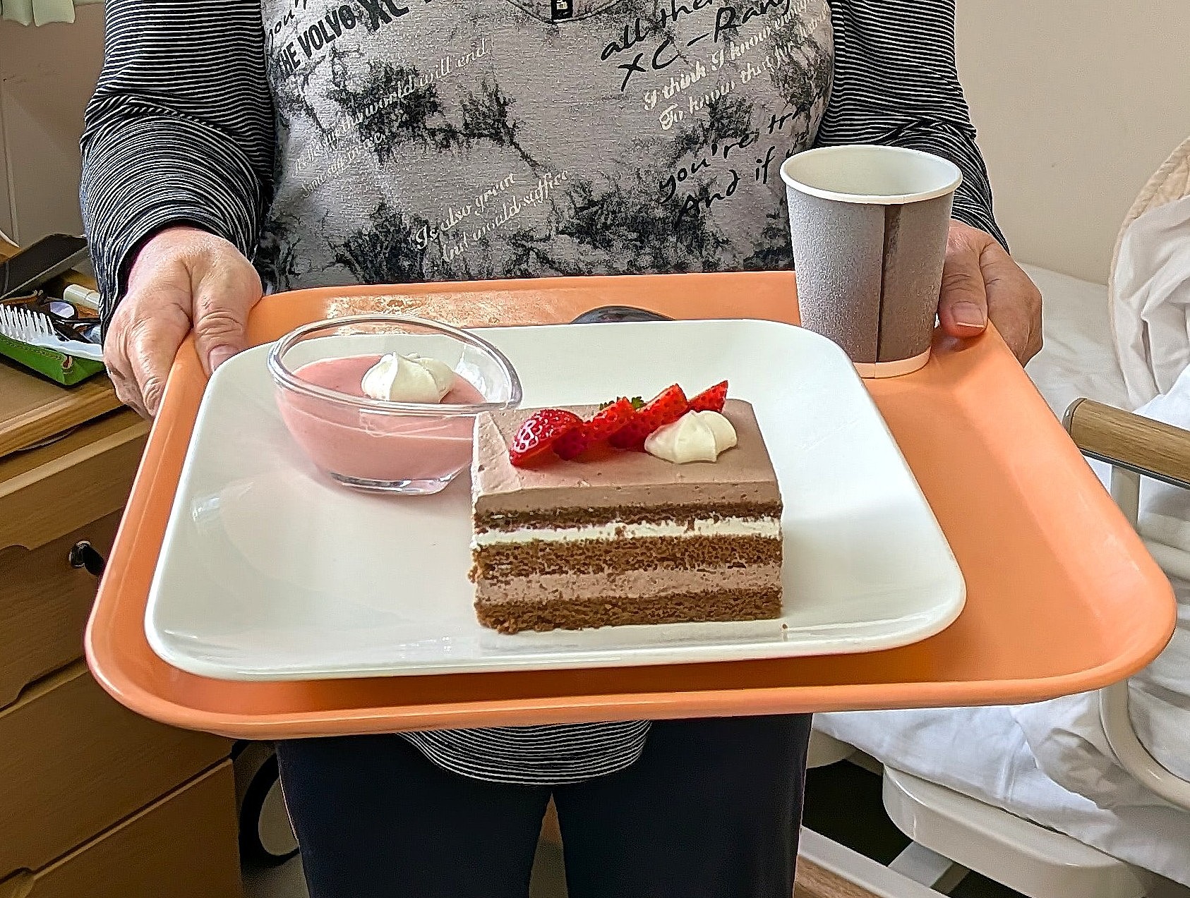 今月のイベント食は、患者さんが特に楽しみにされている「クリスマスケーキ」です。デザート作りを得意とする調理スタッフが、9時間もの時間をかけて一つひとつ丁寧に仕上げたケーキは、専門店にも引けを取らないクオリティ。毎年、患者さんから大変好評をいただいています。今年は、特に人気の高いチョコレートケーキを提供しました。