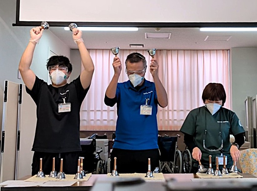 続いては、毎年恒例となっている作業療法士によるハンドベル演奏です。クリスマスソング3曲が披露され、澄んだベルの音色がホールいっぱいに響き渡りました。演奏の途中で少しベルが遅れた場面がありましたが、すかさず「頑張れ!」という応援の声があがりました。また、その優しい音色に合わせて「きよしこの夜」を口ずさむ姿も見られ、心から演奏を楽しまれているようでした。最後には「上手やった!」という感想と満面の笑みをいただくことができました♡