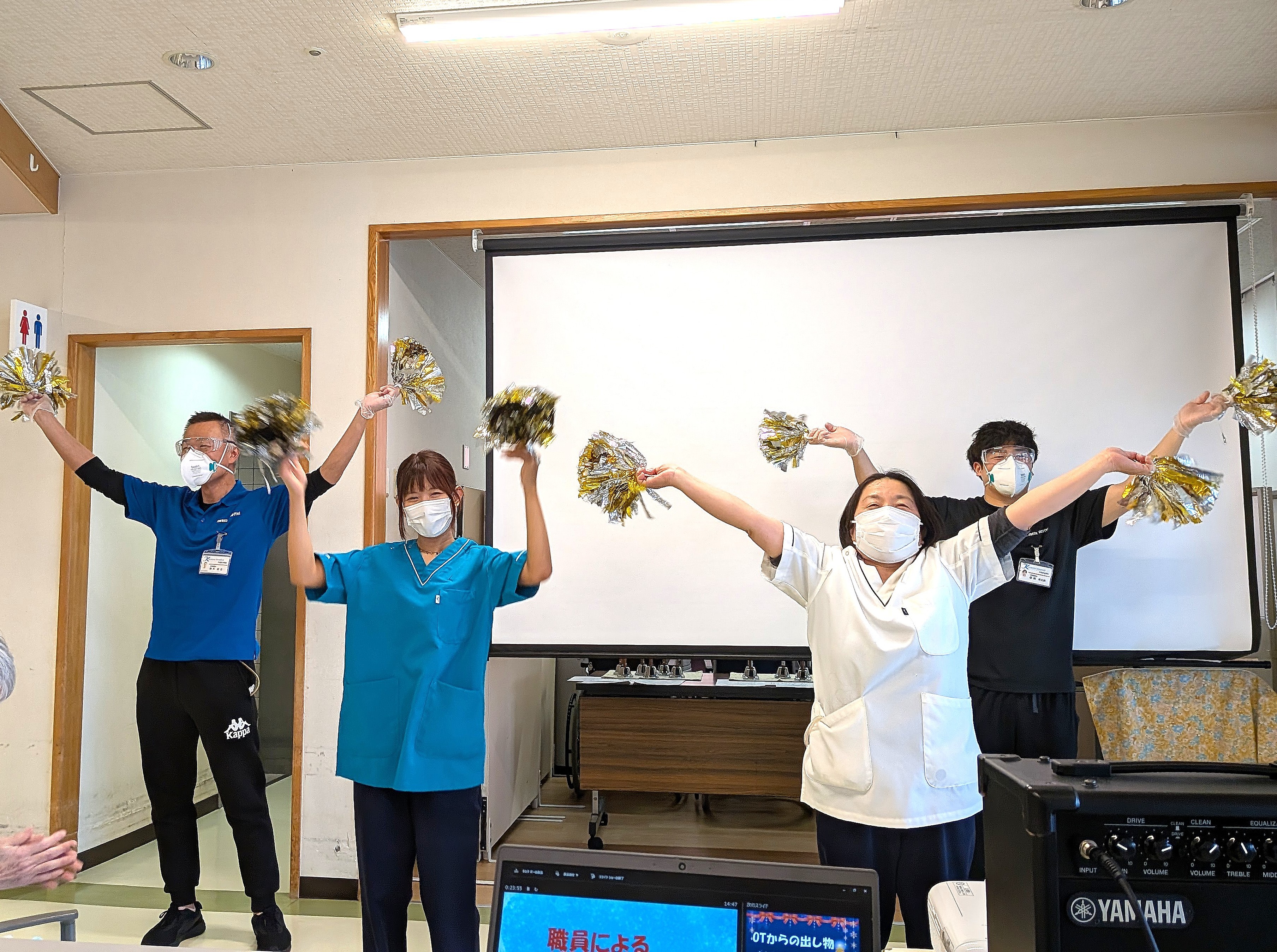 最初のプログラムは、スタッフによるダンス。スクリーンに突然表示された「職員によるダンス披露!」に、患者さんは「何が始まるのだろう」と期待に胸を膨らませておられました。やがて、軽快なリズムにのって登場したスタッフたちに、会場は一気に華やぎます。曲はYMCA!懐かしのメロディーにスタッフの息の合ったダンス。患者さんも自然と笑顔になり、踊りに合わせて一緒に手を動かしたり、手拍子をしたりと、温かな声援がホールを包み込みました。