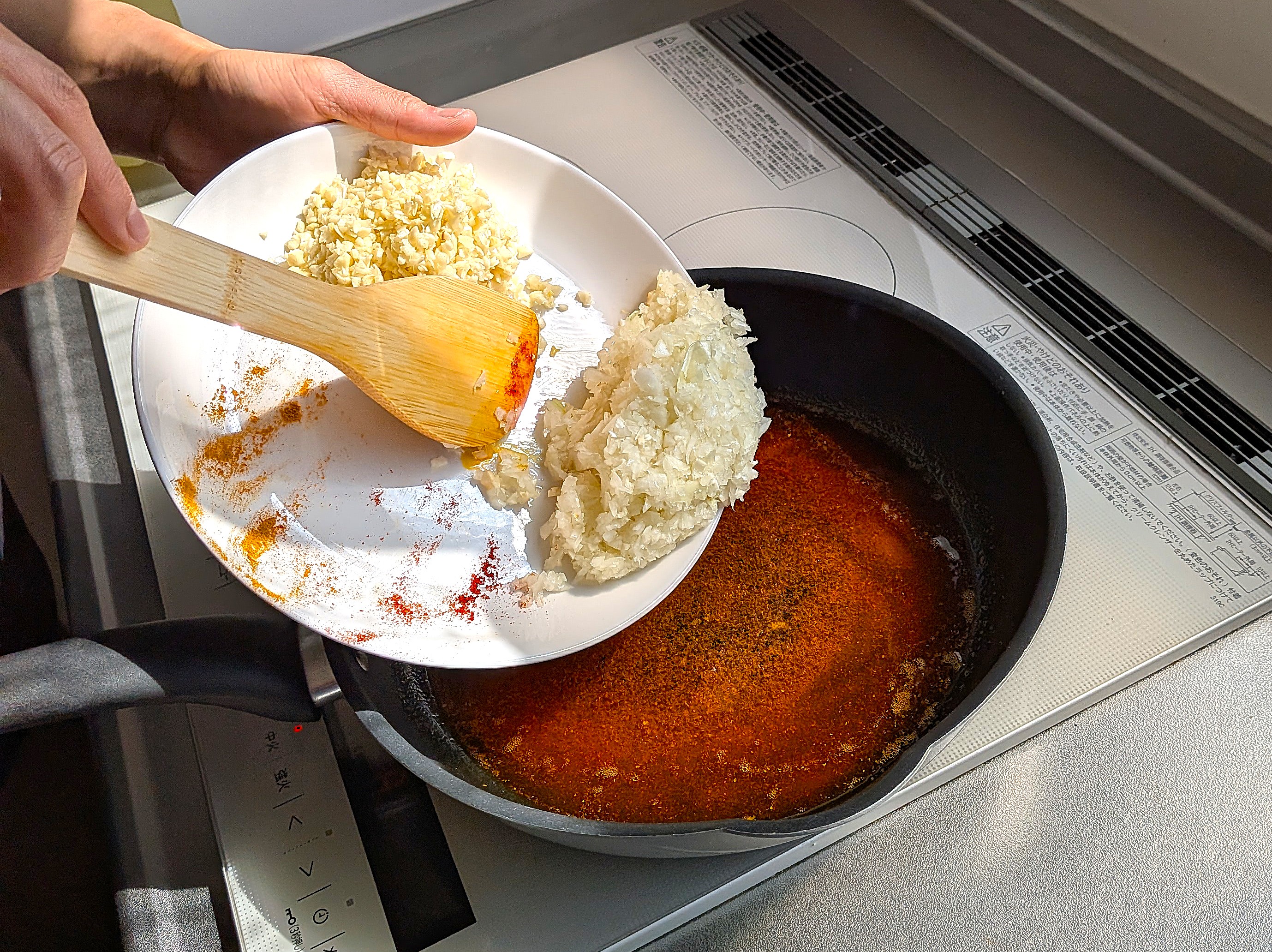 玉ねぎ、にんにく、チリパウダー、ターメリックを入れます