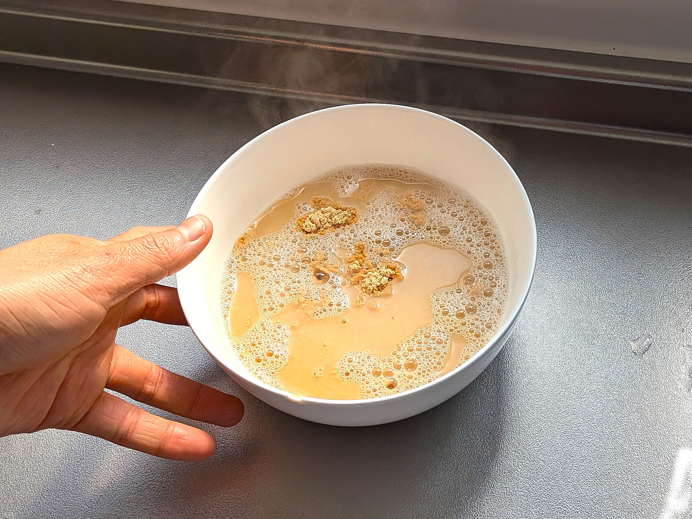 きな粉をお湯で溶かして、鍋に加えます