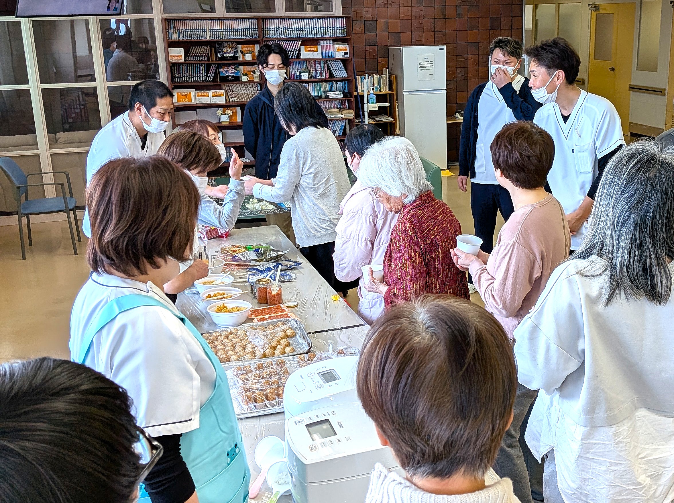 お茶漬けレク‼そのために用意された具材は多彩!定番の鮭や塩昆布、天かす、あられはもちろん、チーズやたこ焼きといった変わり種まで揃えられていました。患者さんは、それらを目の前にしながら思い思いのトッピングをイメージ。「こんな組み合わせも合うんやね」、「次はこれをのせてみようかな」と、話題が絶えません。一見すると意外な組み合わせに思えるものもありましたが、お茶漬けの無限の可能性に気づかされます。なかには、たこ焼きに出汁をかけて“明石焼き風”を楽しまれるといった創意工夫も。一人ひとりがそれぞれのスタイルで楽しむ表情はとてもいいものでした。