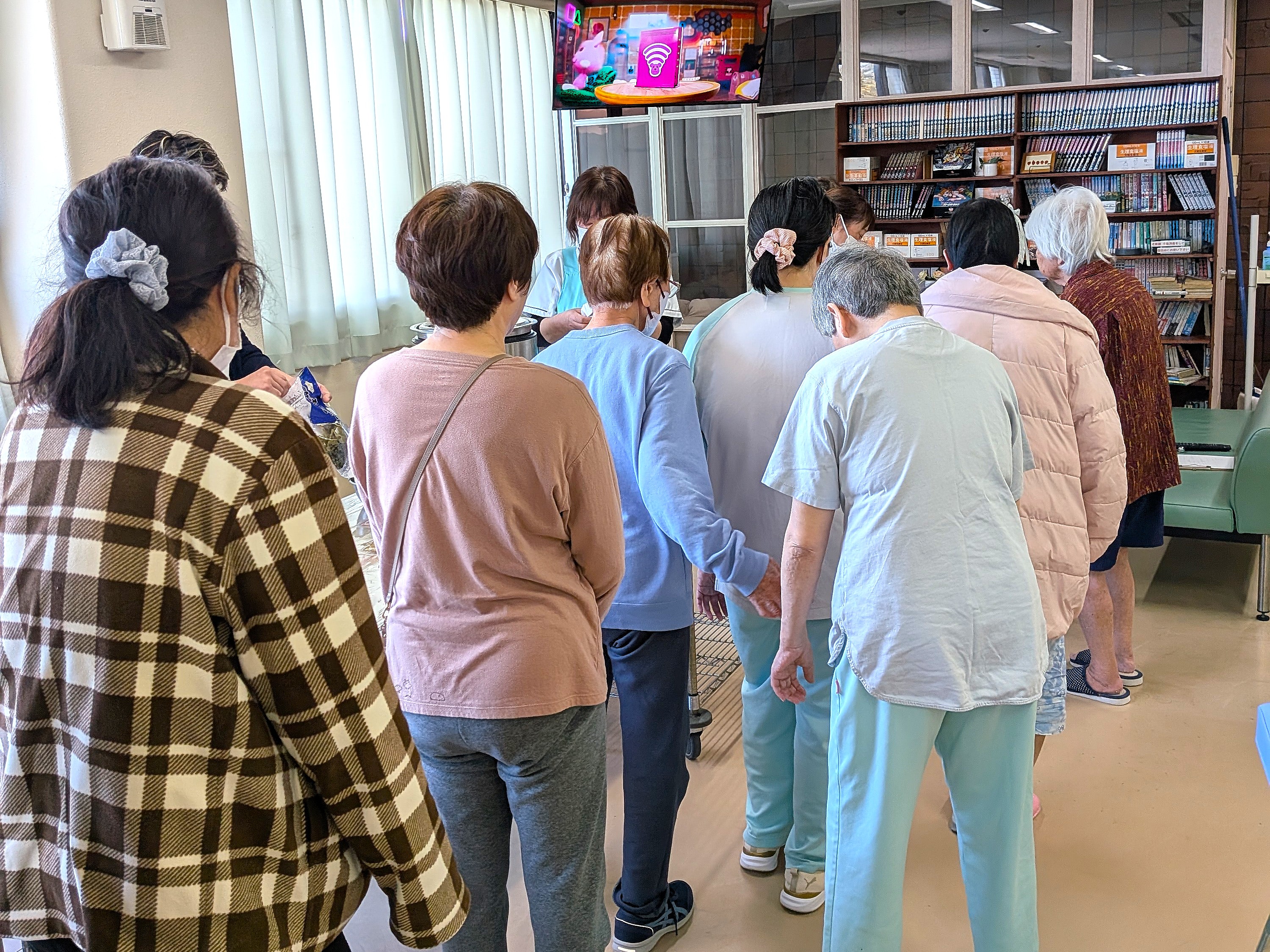 スコップでチョコレート菓子をすくうシンプルなゲームですが、「これを楽しみにしとったとよ」「ジャイアントカプリコが欲しい!」と、皆さん童心に返ったように挑戦されていました。職員の声援を受けながら真剣に、そして楽しそうに取り組まれる姿から、日頃のあたたかな病棟の雰囲気が伝わってきました。