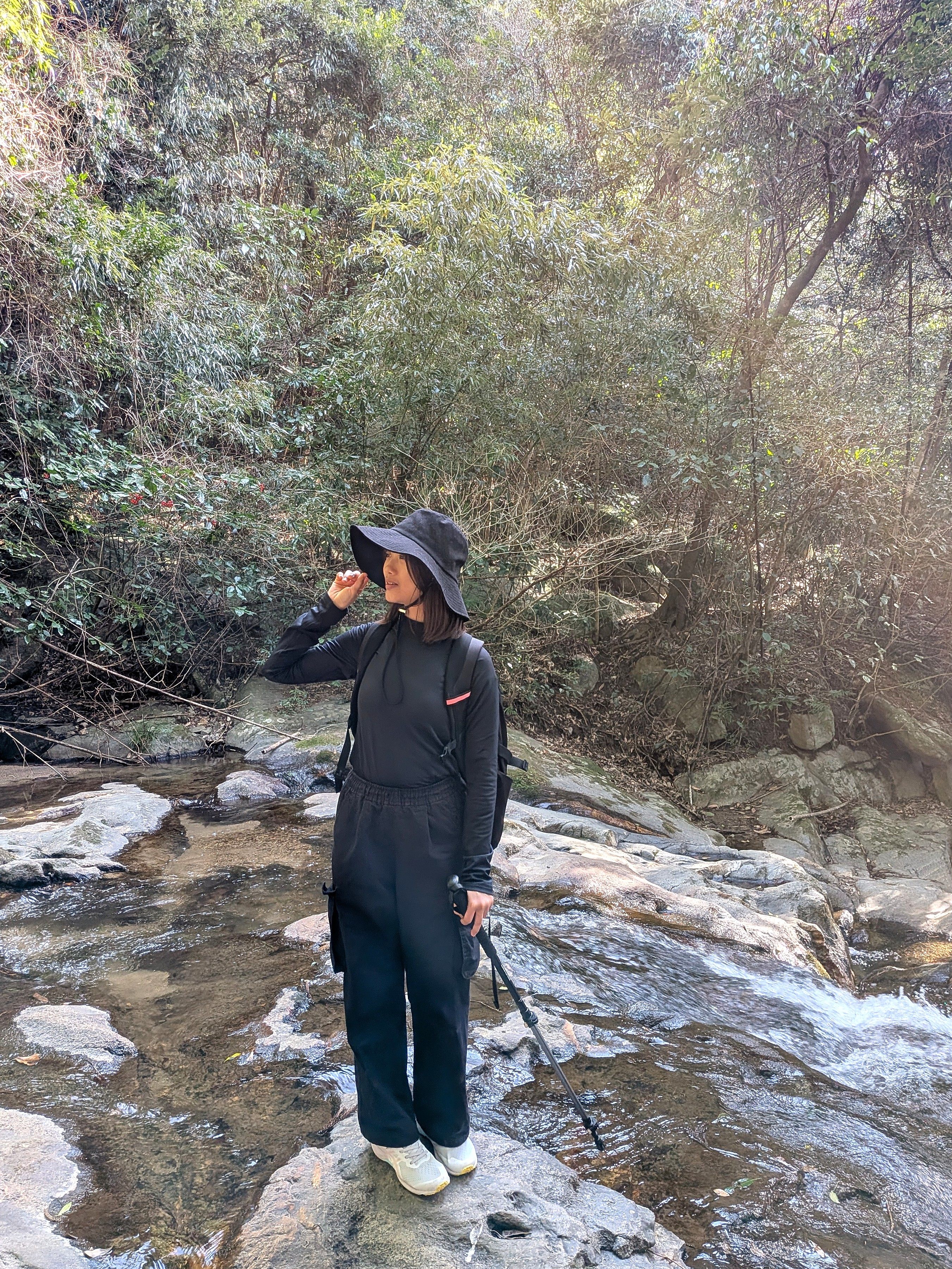 橋を渡りきると、深い緑に包まれた山道へ。土の匂い、鳥の鳴き声、風に揺れる葉音や木漏れ日…全身で自然を感じながらしばらく進むと、遠く聞こえてくる水の音。やがて、「明神の滝」がその姿を現しました。勢いよく流れ落ちる水、ひんやりとした空気、全身を包み込むようなマイナスイオンに思わず足を止めて深呼吸。澄んだ空気に少し疲れたからだをゆだねながら、気持ちや体を整えたら…「いざ、出発!」です。
