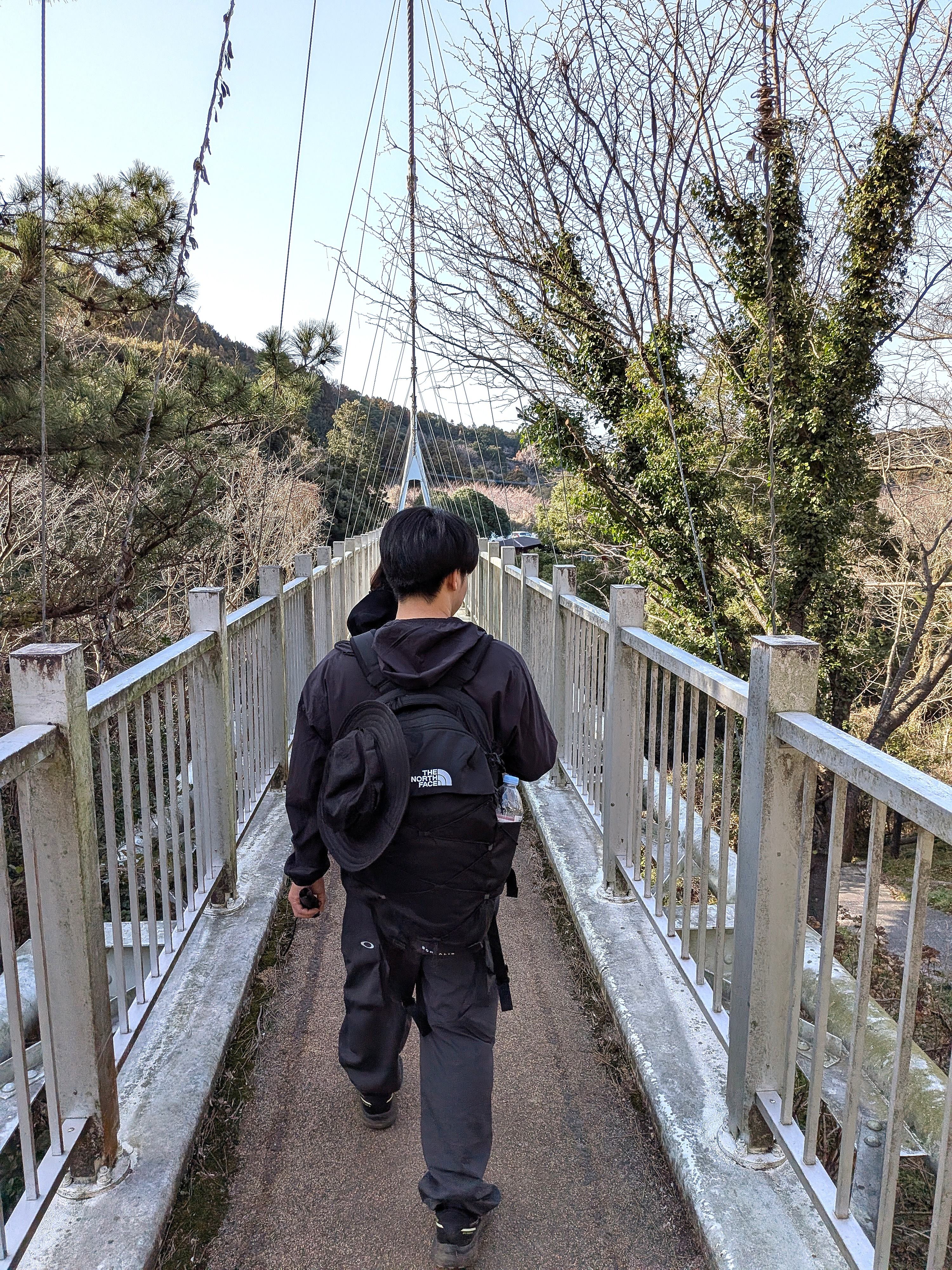登山口を入ると、すぐに1本のワイヤーで吊られた橋が現れます。「ゆらりんこ橋」です。加茂川上流の谷あいにかかる全長100mほどのモダンな吊り橋。高さはけっこうなもので、下をのぞけば思わず足がすくむほどのスリルが、視線を上げて遠くを見渡せば糸島の海や田園風景を楽しめます。